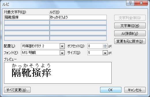 [ルビ]ダイアログボックスにて[文字単位]ボタンをクリックし、プレビューで文字単位でふりがなが振られていることを確認して[OK]ボタンをクリックします。