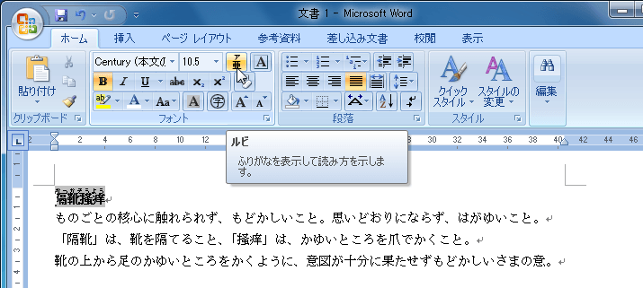 Word 2007で読みにくい漢字にふりがなをふるには、[ホーム]タブの[フォント]グループにある[ルビ]のボタンをクリックし、[ルビ]ダイアログボックスにて設定します。