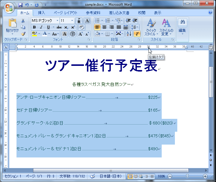Word 2007でタブを使用して、文字列を特定の位置に揃えることができます。Tabキーを押すことでタブ位置(初期設定は左インデントから4文字間隔)を設定します。タブ位置を任意の場所に設定することもできます。また、リーダーを設定して、タブ位置の左側に線を表示することも可能です。