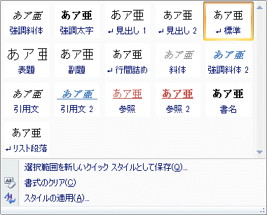 Wordでの組み込みスタイルで既定で選択されているスタイルは「標準」であり、[スタイル]のクイックスタイルボックス一覧に既定で表示されるものは以下の通りです。