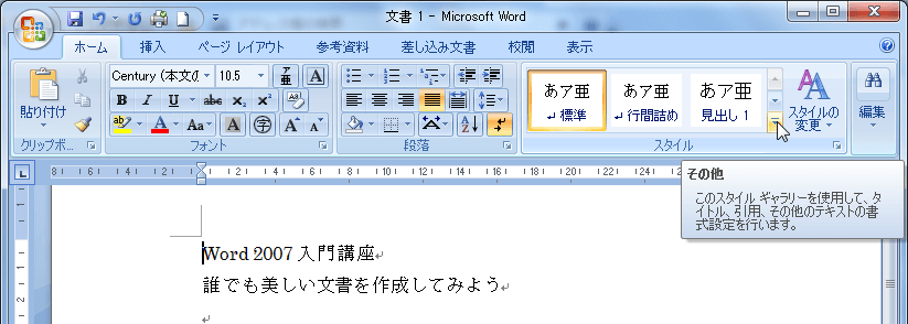 - [ホーム]タブの[スタイル]のクイックスタイル一覧から[表題]を選択します。すべてを表示するには、右下の[その他]をクリックして、一覧から選択します。