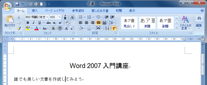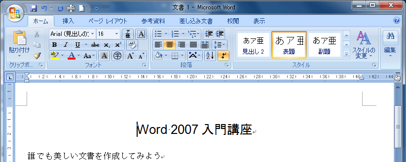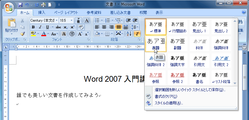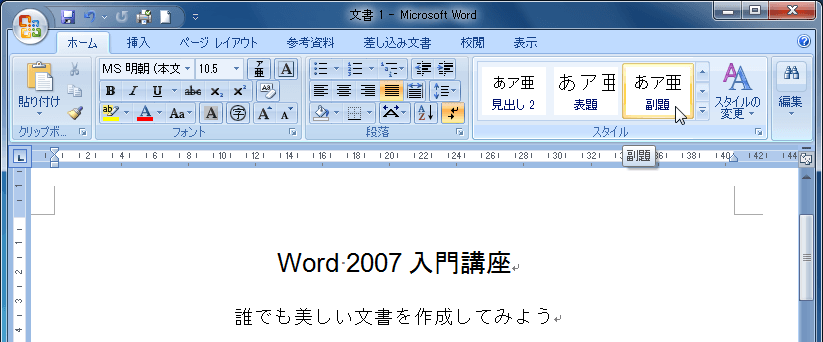 Wordでの組み込みのスタイルとして、見出しのほかに「表題」「副題」「引用文」などがあります。Word 2007で文書のタイトルを「表題」に、そのサブタイトルを「副題」にしてみましょう。