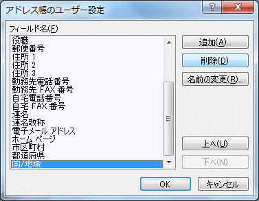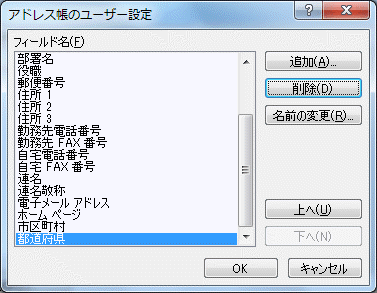 - [アドレス帳のユーザー設定]ダイアログボックスが表示されたら、不要なフィールド名を選択し[削除]ボタンをクリックします。