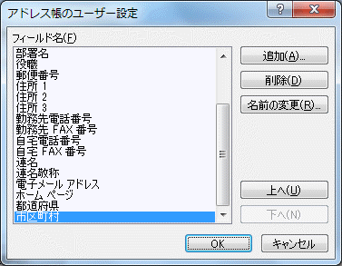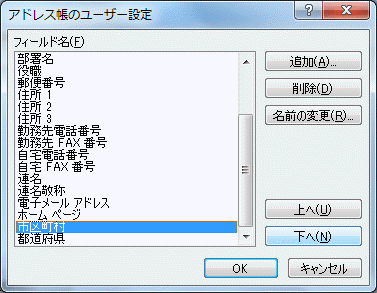 - [アドレス帳のユーザー設定]ダイアログボックスが表示されたら、フィールド名を選択して[上へ]または[下へ]をクリックします。たとえば、[市区町村]を[都道府県]の下に移動したい場合は、[市区町村]を選択して[下へ]をクリックします。