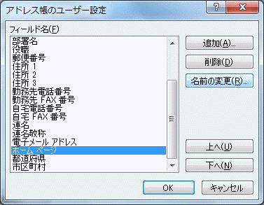 - [アドレス帳のユーザー設定]ダイアログボックスの[フィールド名]一覧から変更したいフィールド名を選択して[名前の変更]ボタンをクリックします。
