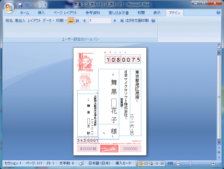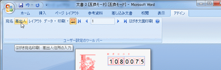 はがき宛名印刷ウィザードのときに差出人を印刷しないようにした場合など、差出人住所をあとで入力するには、Word 2007で[アドイン]タブにある[はがき宛名印刷]ツールバーを利用します。