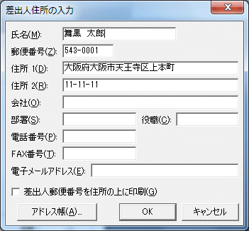 - [差出人住所の入力]ダイアログボックスが表示されるので、それぞれ入力して[OK]ボタンをクリックします。