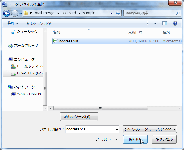- [データ ファイルの選択]ダイアログボックスで、住所録ファイルを選択して[開く]ボタンをクリックします。