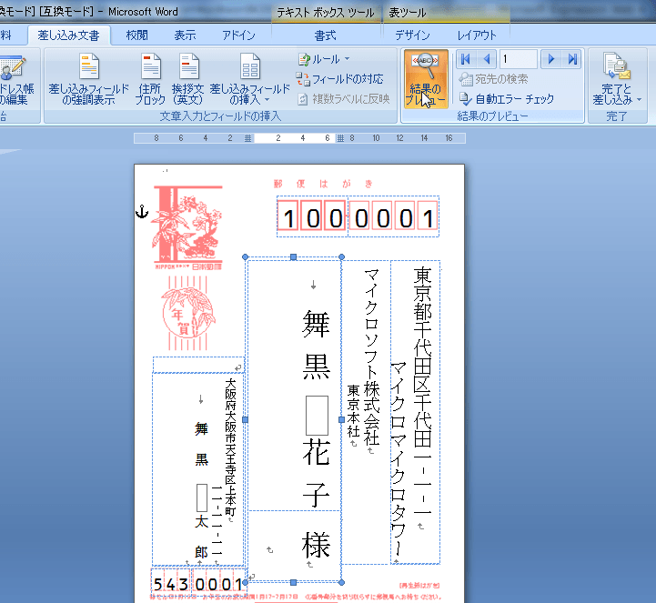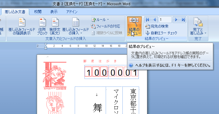 - [差し込み文書]タブを開いて[結果のプレビュー]を有効にすると、正常に姓名が差し込まれました。