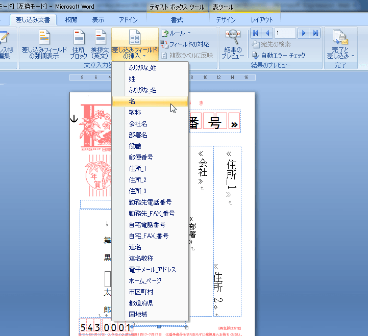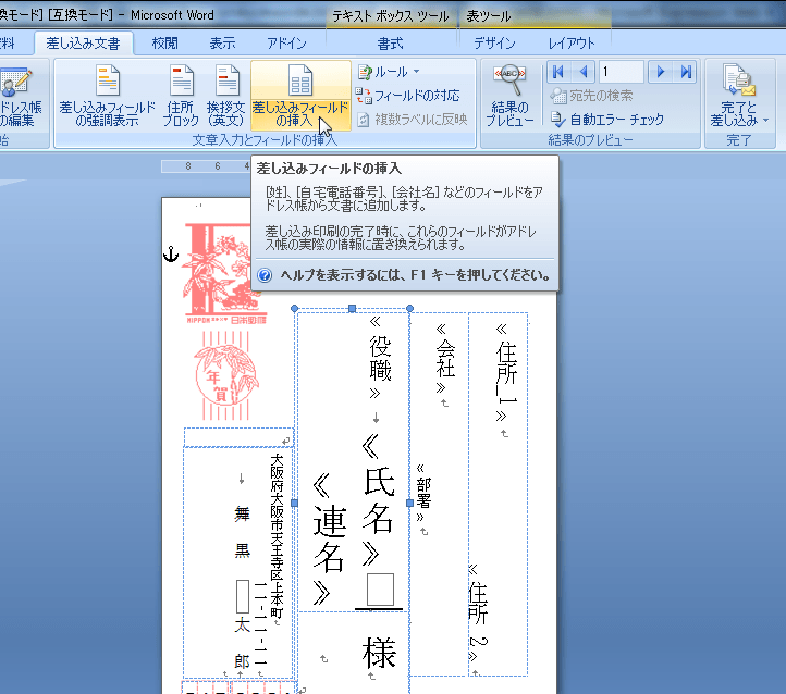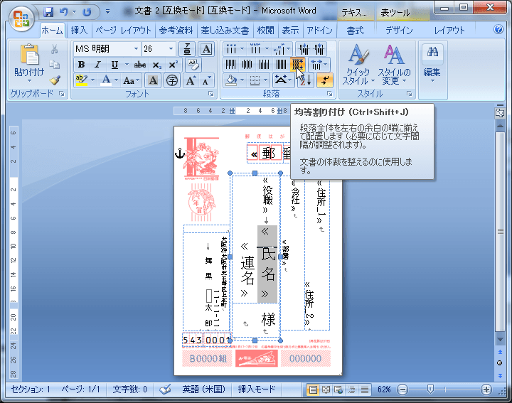 ただし、宛名部分は行単位の均等割り付けが設定されているので、解除してから名字の下にスペースを入れてから名前フィールドを追加し、均等割り付けをやり直すとOKです。