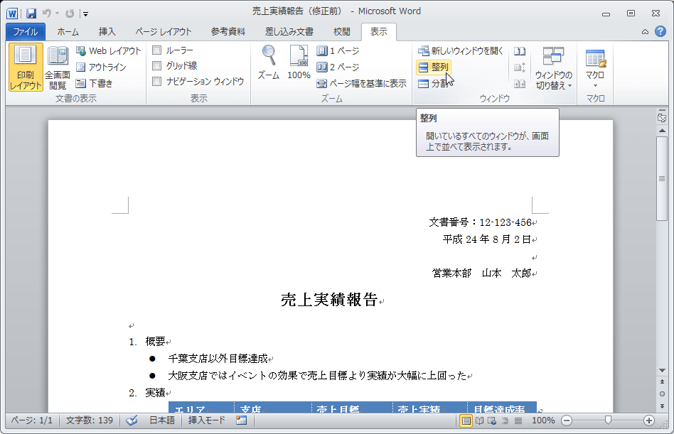 すでに何かファイルを開いた状態で、ならべて表示したい別の文書を後で追加することもできます。たとえば、「売上実績報告」ファイルを開いた状態で、追加で「売上実績報告(修正前)」のファイルを開くことにより、[ウィンドウ]グループの[整列]をクリックすることで、文書を上下に並べて表示できます。