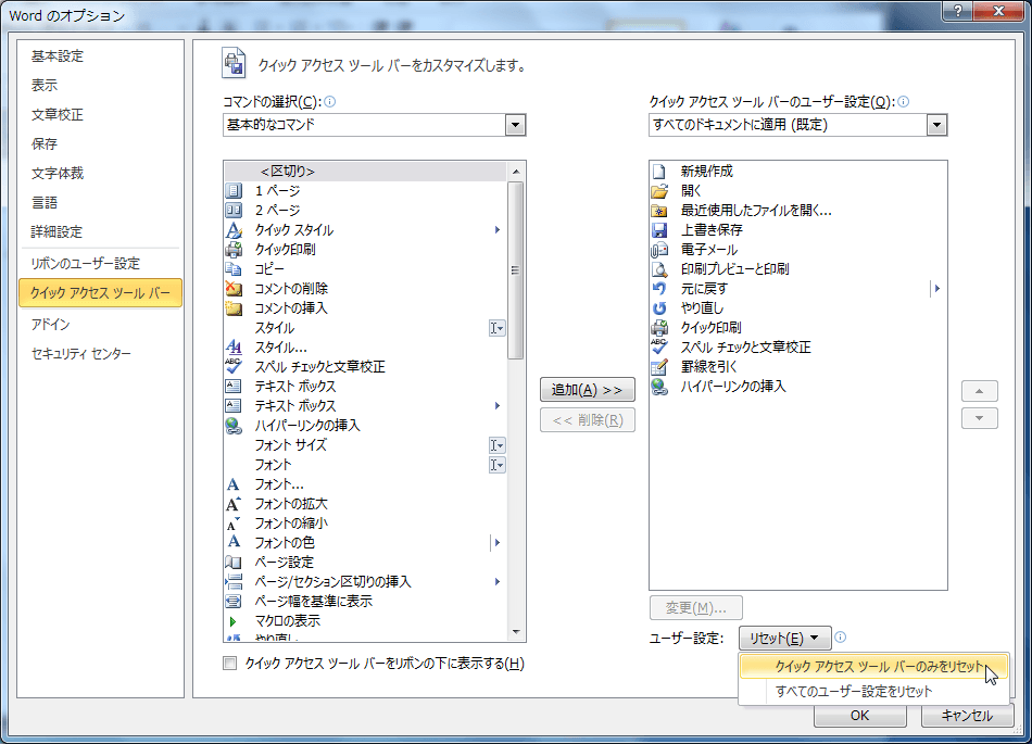 - [Wordのオプション]ダイアログボックスの[クイックアクセスツールバー]が開かれたら、[リセット]ボタンをクリックして、[クイックアクセスツールバーのみをリセット]をクリックします。