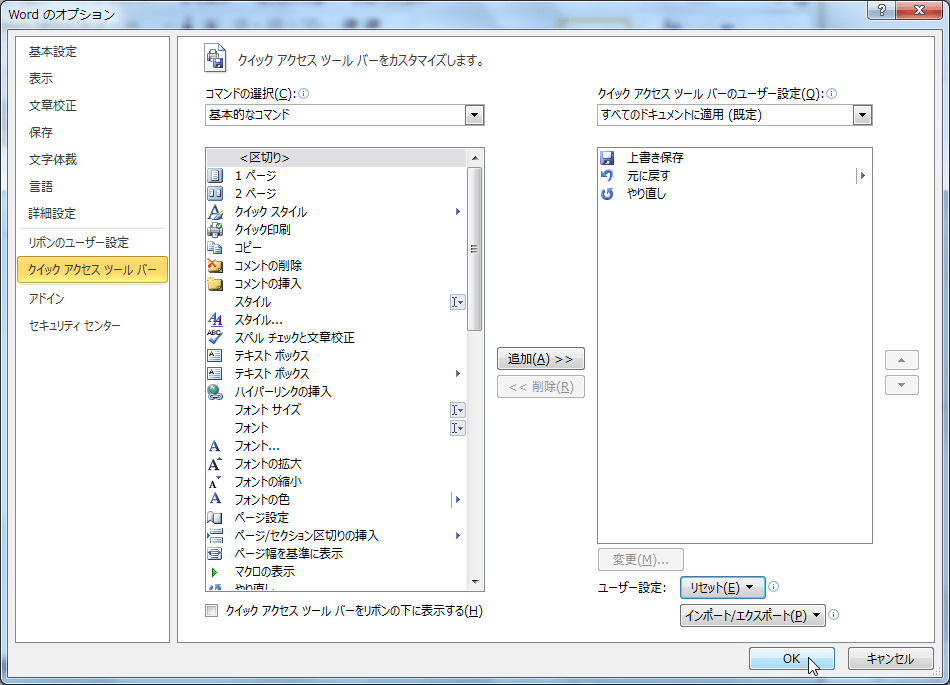 クイックアクセスツールバーをリセットするには