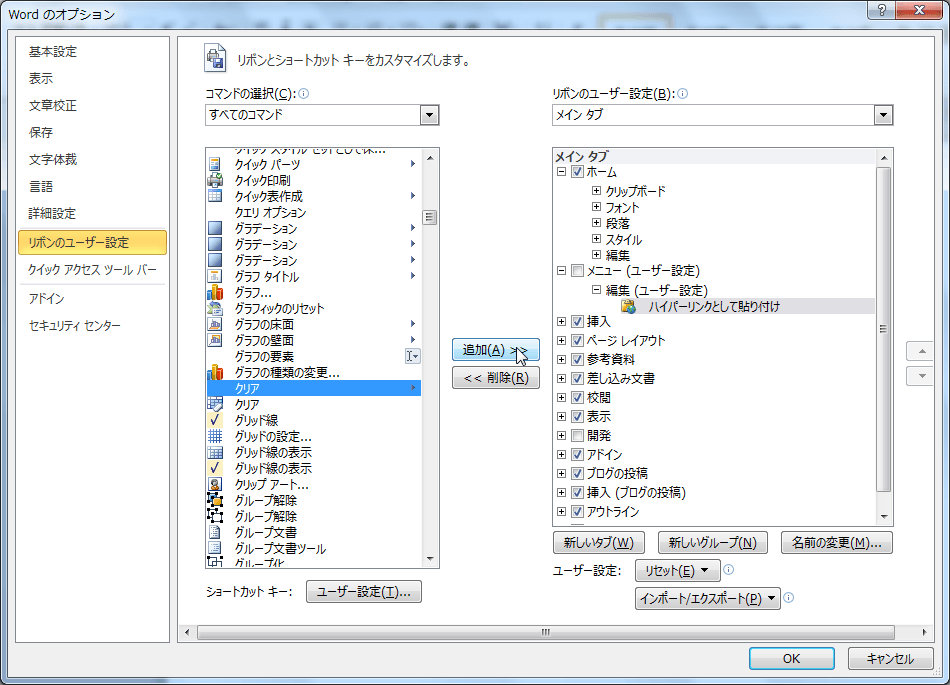 - [すべてのコマンド]一覧から[ハイパーリンクとして貼り付け]を選択し、[追加]ボタンをクリックします。