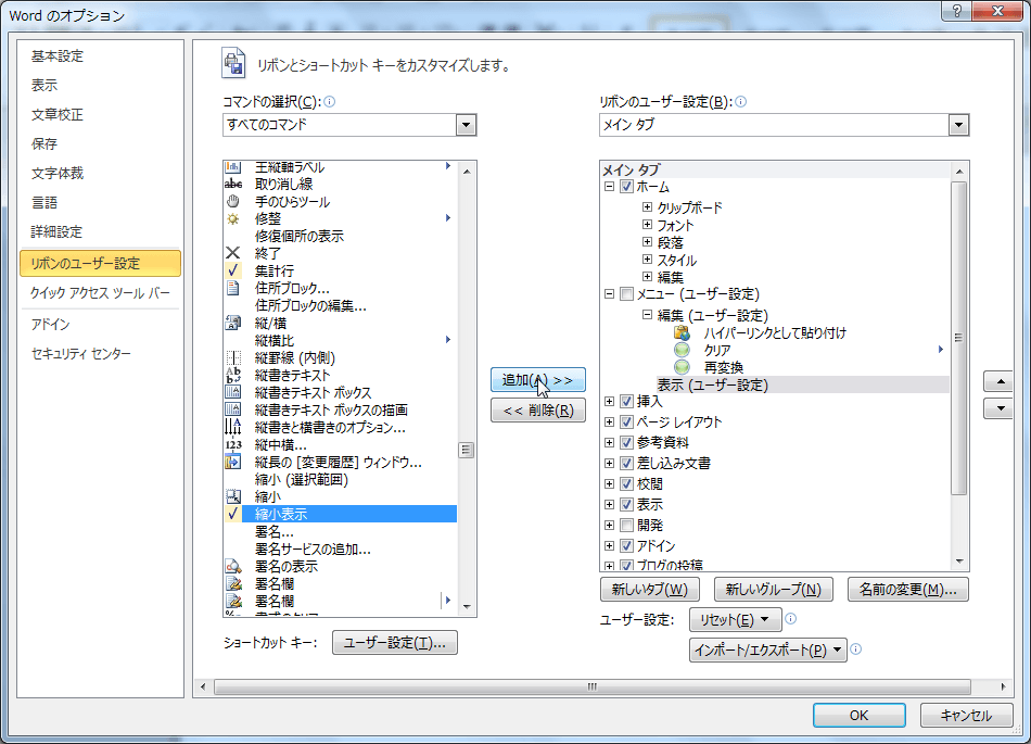 - [すべてのコマンド]一覧から[縮小表示]を選択し、[追加]ボタンをクリックします。