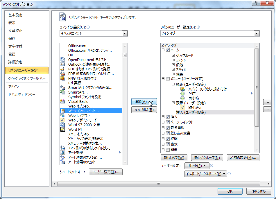 - [すべてのコマンド]一覧から[Webコンポーネント]を選択し、[追加]ボタンをクリックします。