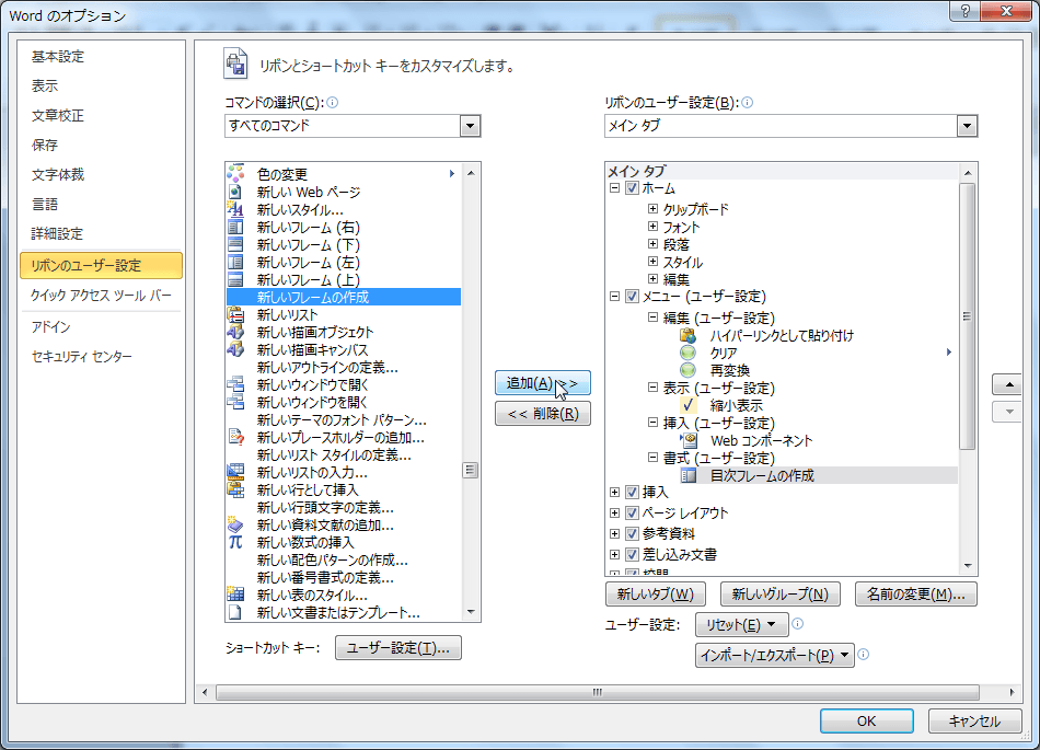 - [すべてのコマンド]一覧から[新しいフレームの作成]を選択し、[追加]ボタンをクリックします。