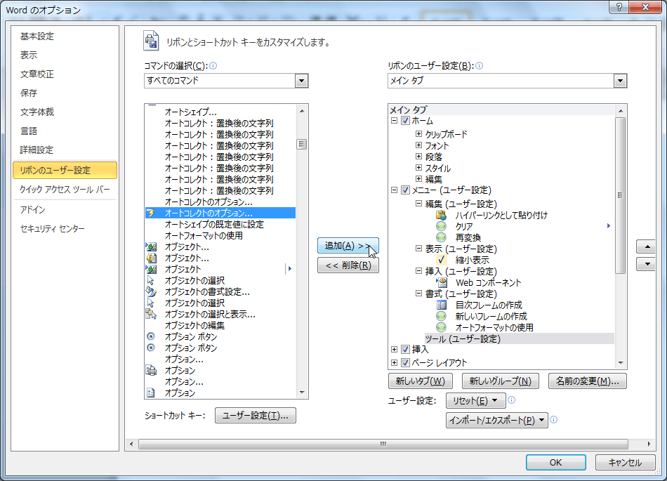 - [すべてのコマンド]一覧から[オートコレクトのオプション]を選択し、[追加]ボタンをクリックします。