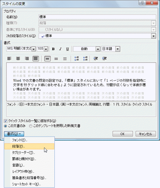 - [スタイルの変更]ダイアログボックスの右下にある[書式]ボタンをクリックし、[段落]を選択します。