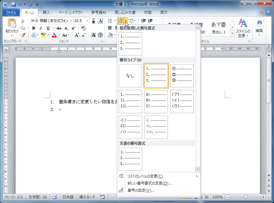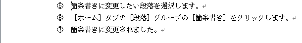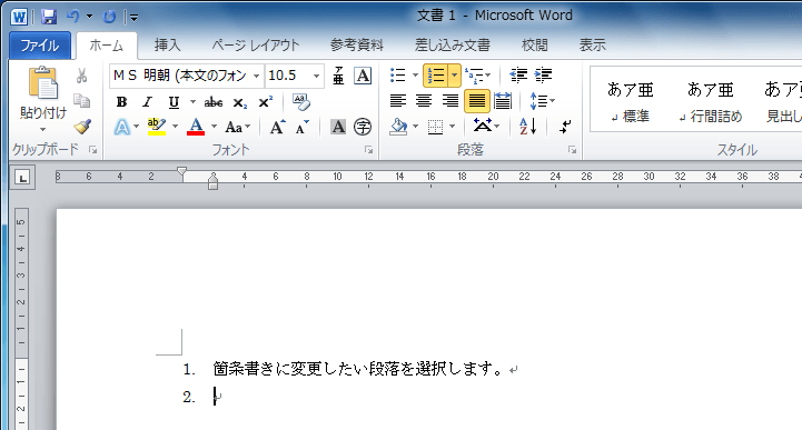 - [ホーム]タブの[段落番号]ボタンをクリックします。