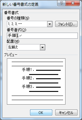 - [新しい番号書式の定義]ダイアログボックスの[番号書式]の先頭に「手順」と入力して[OK]ボタンをクリックします。