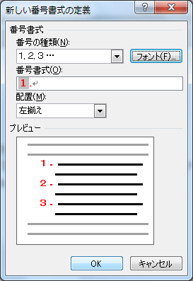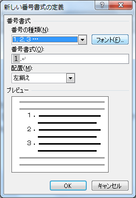 - [新しい番号書式の定義]ダイアログボックスの[番号の種類]ボックスから「1,2,3…」を選択します。