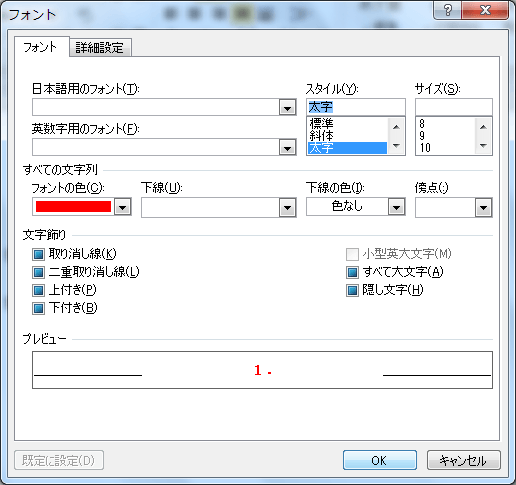 - [フォントの色]一覧から赤色を選択して[OK]ボタンをクリックします。