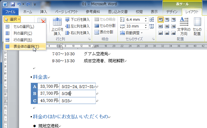 - [表]グループの[選択]をクリックし、[表全体の選択]をクリックします。