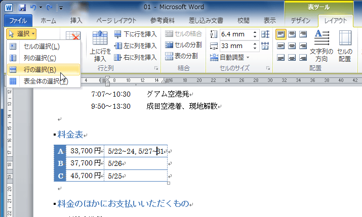 - [表]グループの[選択]をクリックし、[行の選択]をクリックします。