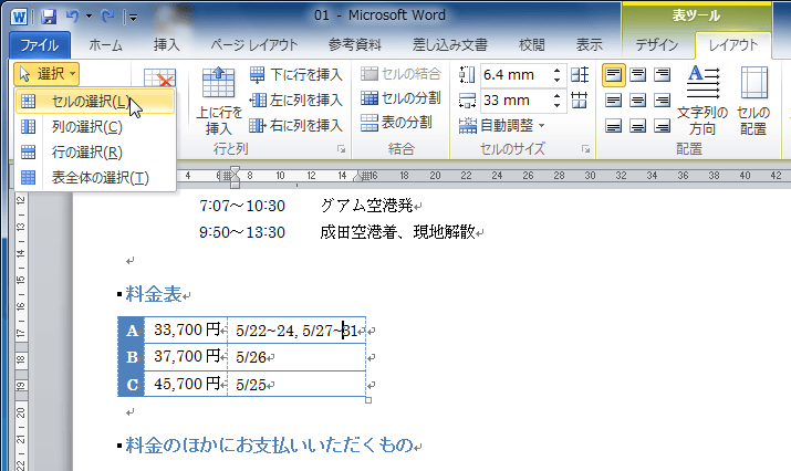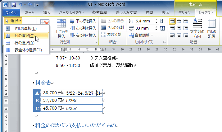 - [表]グループの[選択]をクリックし、[列の選択]をクリックします。