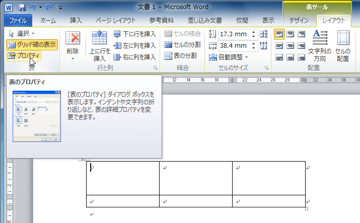 - [表ツール]の[レイアウト]タブを開き、[表のプロパティ]をクリックします。