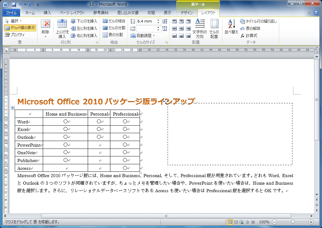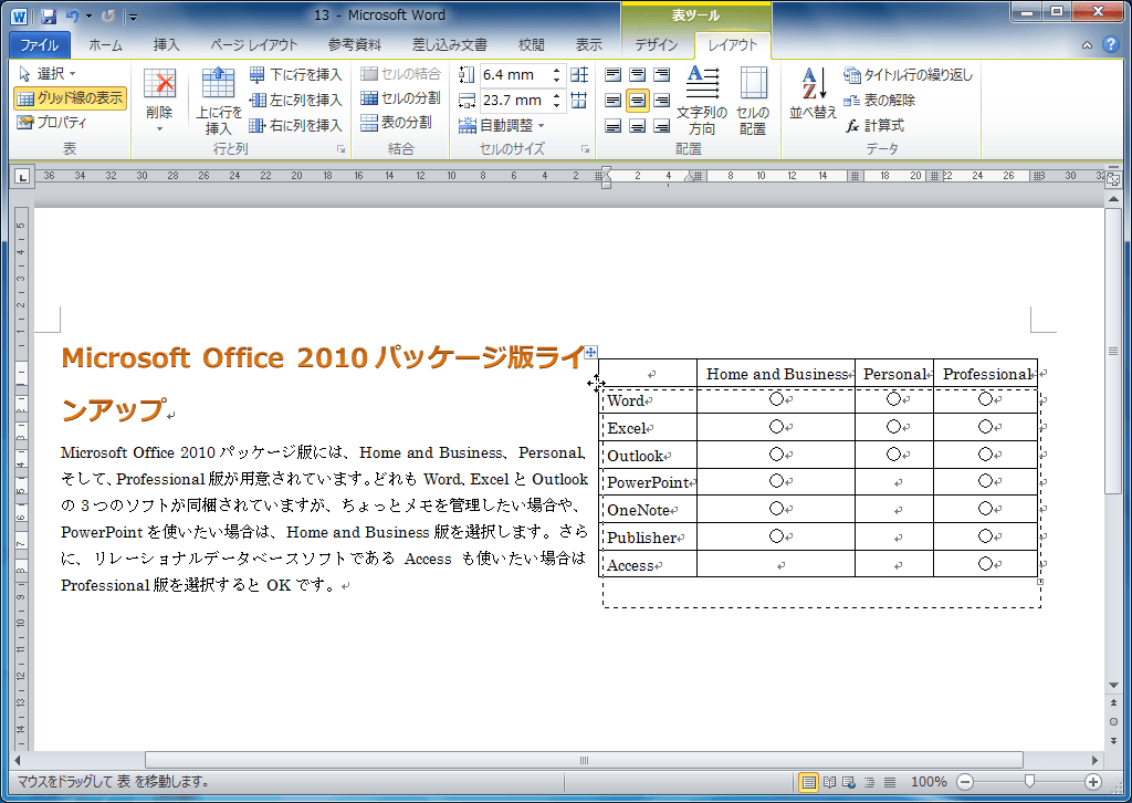表の周りに文字列を折り返すには、[表のプロパティ]ダイアログボックスで設定するか、マウスで配置したい場所までドラッグします。