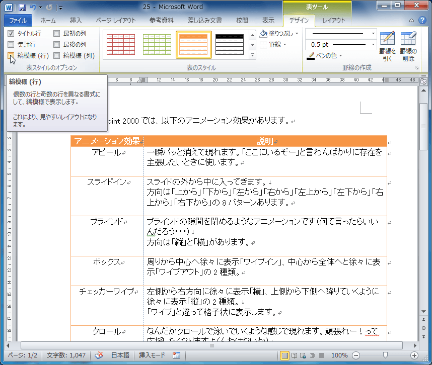 - [縞模様(行)]のチェックを外すと、縞模様のスタイルが解除されます。