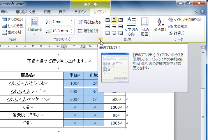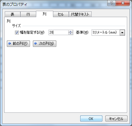 - [表のプロパティ]ダイアログボックスの[列]タブを開きます。