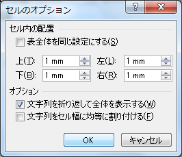 一部のセルの余白を設定した後、表全体の既定のセルの余白に戻したい場合、[セルのオプション]ダイアログボックスの[表全体を同じ設定にする]のチェックを付けます。