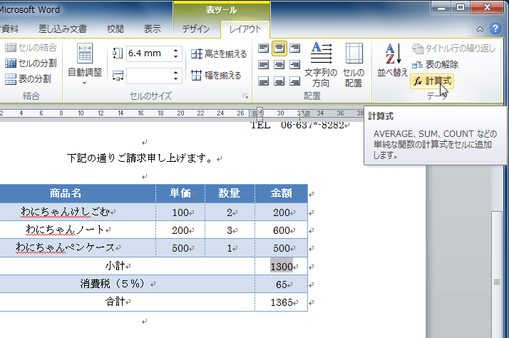- 小計セルにカーソルを移動して、[表ツール]の[レイアウト]タブを開きます。