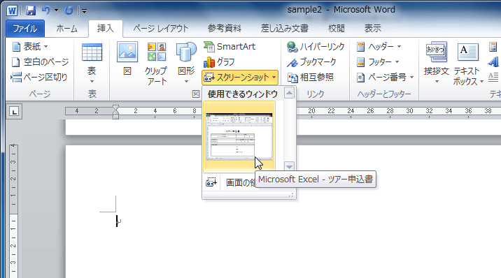 - [図]グループの[スクリーンショット]をクリックして、一覧から目的のウィンドウをクリックします。