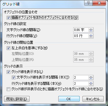 - [グリッド線を表示する]にチェックを入れて[文字グリッド線を表示する間隔(本)]にチェックを入れ「2」に、[行グリッド線を表示する間隔(本)]にも同じく「2」と設定して[OK]ボタンをクリックします。