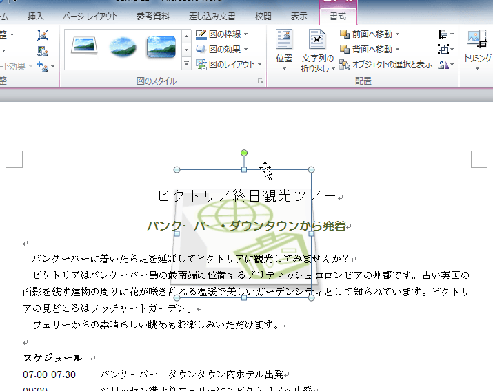 基本的に、クリップアートの配置方法は、図の配置方法と同じです。ここでは、テキストの背面にクリップアートを配置する方法について説明します。