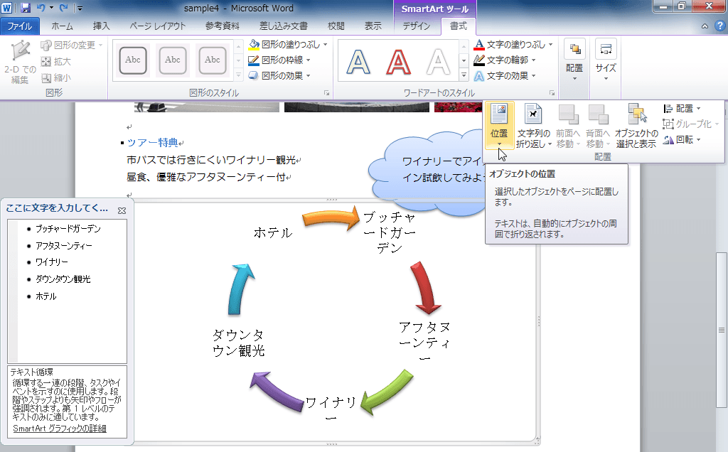 SmartArtグラフィックをページの所定の位置に配置するには、[SmartArtツール]の[書式]タブを開き、[配置]グループの[位置]の一覧から配置場所を選択します。