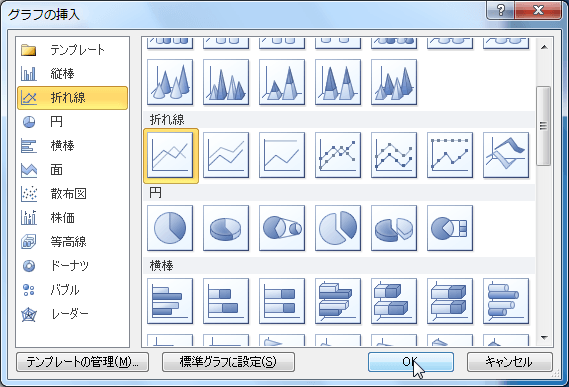 - [グラフの挿入]ダイアログボックスの[折れ線]カテゴリより[折れ線]を選択して[OK]ボタンをクリックします。