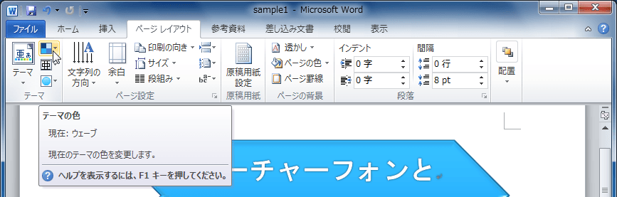 - [ページレイアウト]タブを開き、[テーマ]グループの[テーマの色]をクリックします。