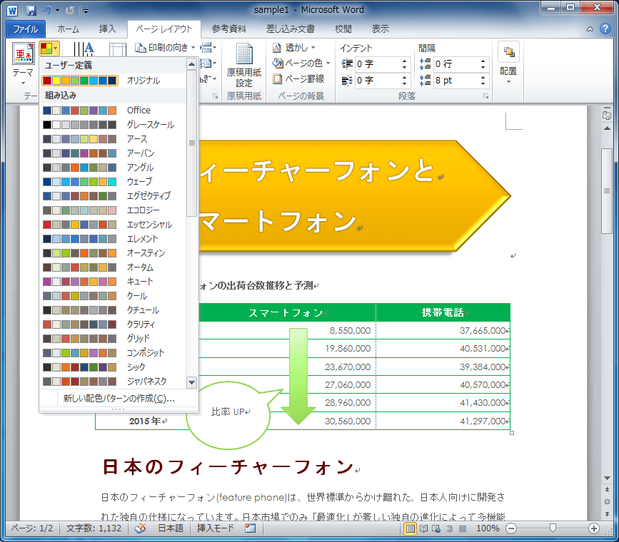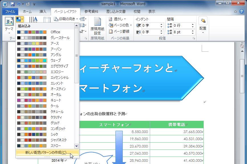 組み込みのテーマの配色にぴったりなものがない場合、独自で新しい配色パターンを作成することができます。[ページレイアウト]タブを開き、[テーマ]グループの[テーマの色]のなかから[新しい配色パターンの作成]をクリックして、それぞれ配色を割り当てます。