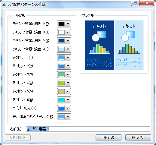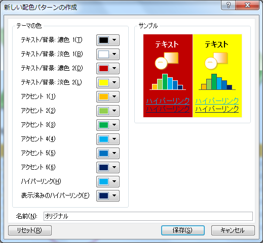 - [新しい配色パターンの作成]ダイアログボックスが表示されたら、テーマの色グループからそれぞれの要素の色を指定していきます。