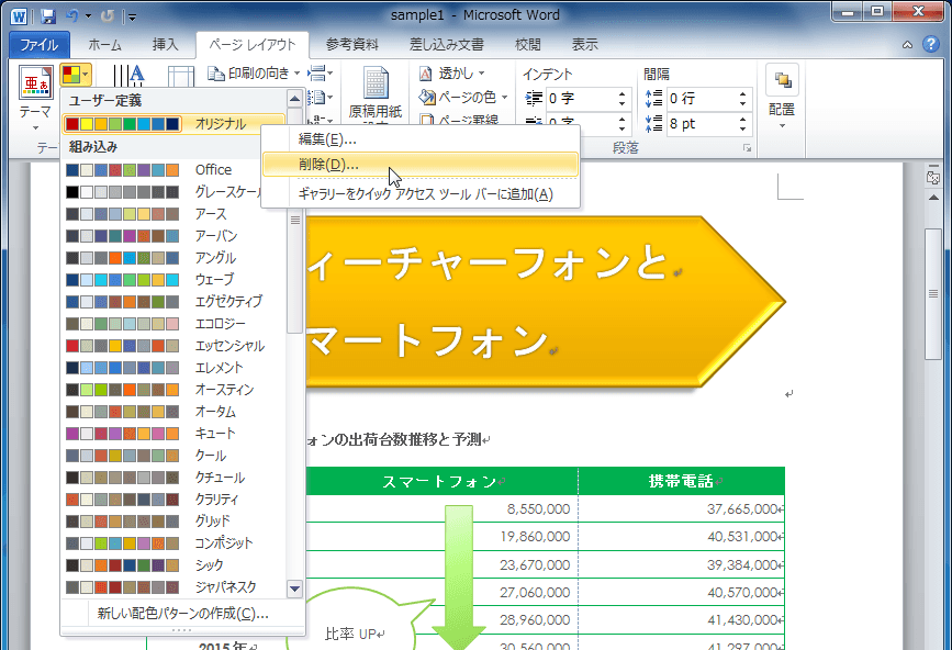 [テーマの色]から[ユーザー定義]の作成した配色を右クリックして、ショートカットメニューより[削除]をクリック