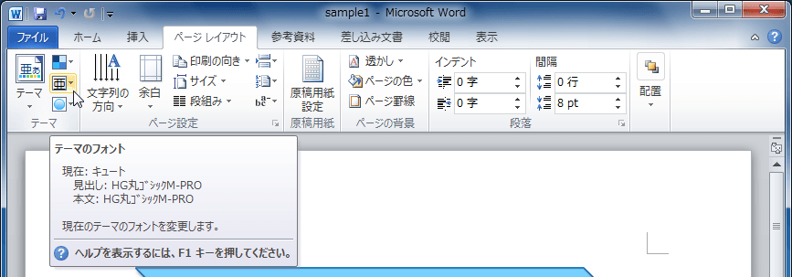 - [ページレイアウト]タブを開き、[テーマ]グループの[テーマのフォント]をクリックします。