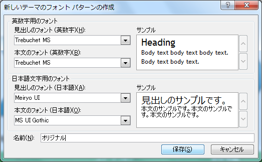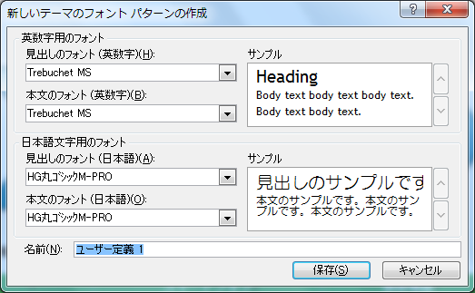 [テーマのフォントの編集]ダイアログボックスでそれぞれ変更して[保存]ボタンをクリック