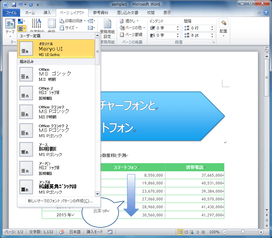 既存のテーマのフォントパターンに適用したいものがない場合、独自にフォントパターンを作成することができます。[ページレイアウト]タブを開き、[テーマ]グループの[テーマのフォント]一覧から[新しいテーマのフォントパターンの作成]を選択して、フォントを指定します。