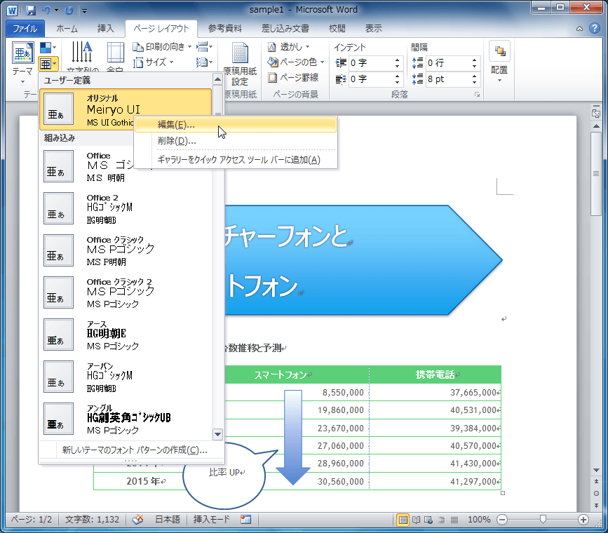 [テーマのフォント]から[ユーザー定義]の作成した配色を右クリックして、ショートカットメニューより[編集]をクリック