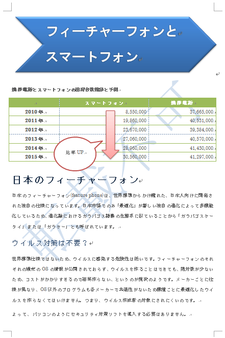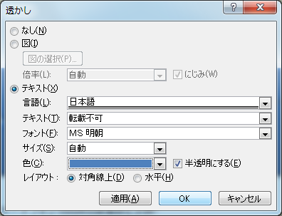ここでは、テキストが「転載不可」、透かし文字色を「青、アクセント1」で、対角線上に半透明で設定する方法について説明します。